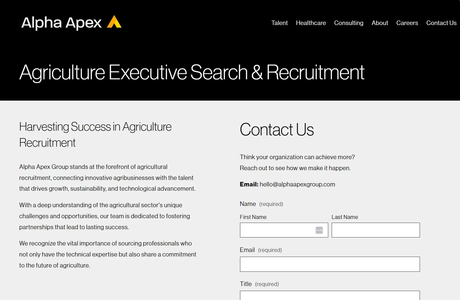 Alpha Apex Group: Alpha Apex Group is a premier executive search firm for the agriculture sector, specializing in connecting companies with leaders who excel in driving sustainable growth, pioneering agricultural innovation, and navigating the global food system's complexities.