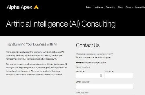 Alpha Apex Group is a premier consulting firm specializing in artificial intelligence (AI) services, helping businesses leverage AI to drive innovation and operational efficiency. With a team of AI experts, they provide strategic insights and cutting-edge solutions tailored to each client's unique needs.