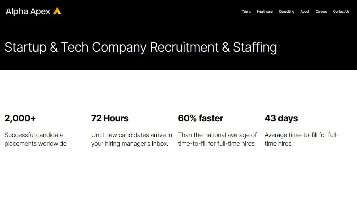 Alpha Apex Group: Alpha Apex Group excels as a standout recruiter, specializing in connecting forward-thinking startups and tech companies with visionary talent tailored to thrive in the competitive tech ecosystem.