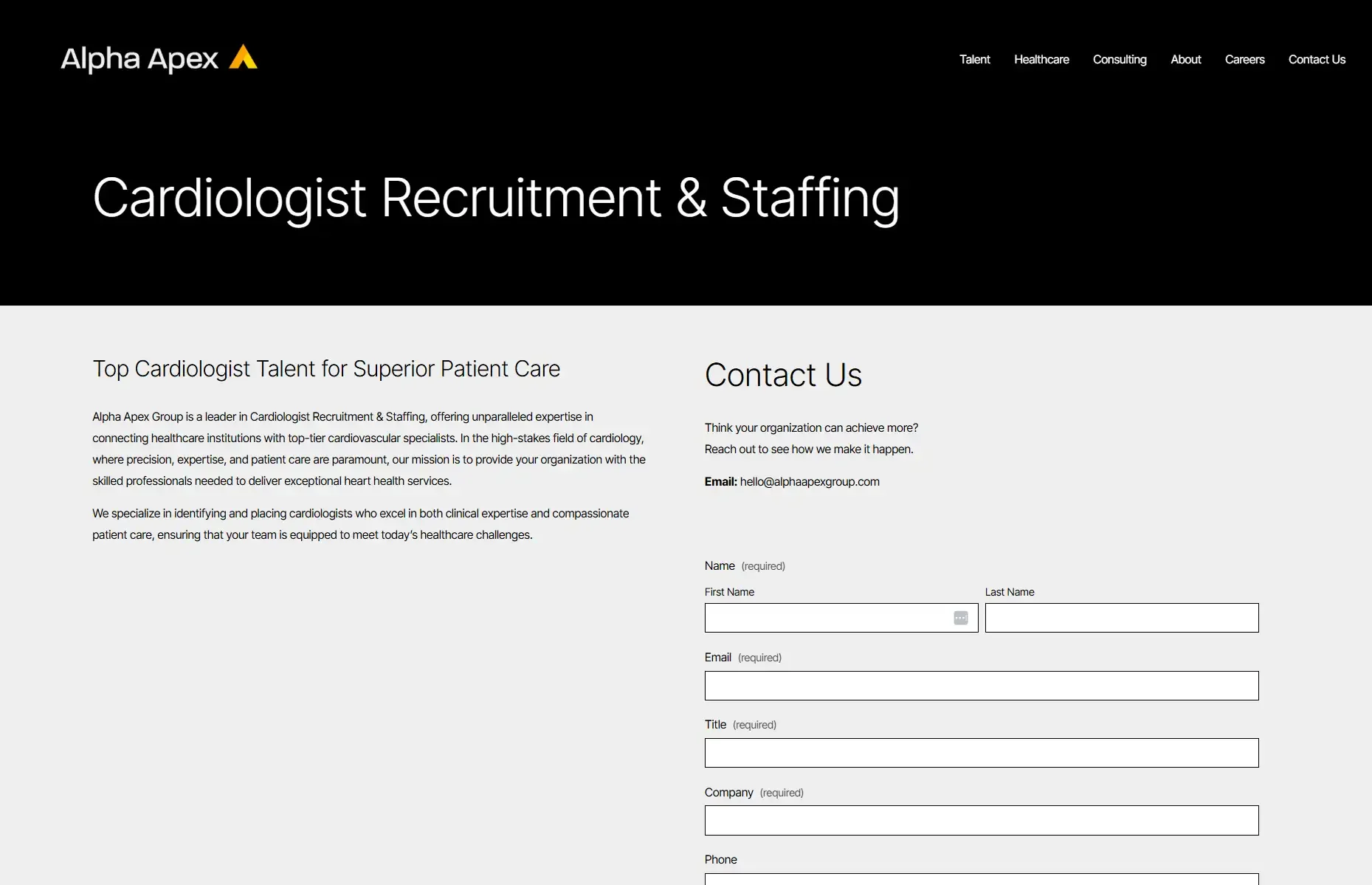 Alpha Apex Group: Alpha Apex Group is a leading recruiting and consulting firm that connects healthcare organizations with top cardiologists through tailored staffing solutions and expertise in the medical industry.