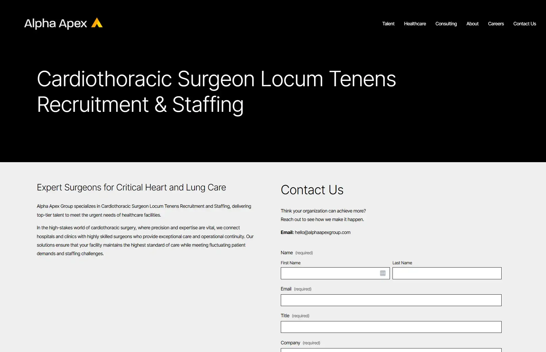 Alpha Apex Group excels at matching highly skilled cardiothoracic surgeons with healthcare organizations that require elite surgical expertise. Their extensive network and proven experience make them a trusted partner for ensuring the right talent is placed quickly and efficiently, tailored to each organization’s unique needs.
