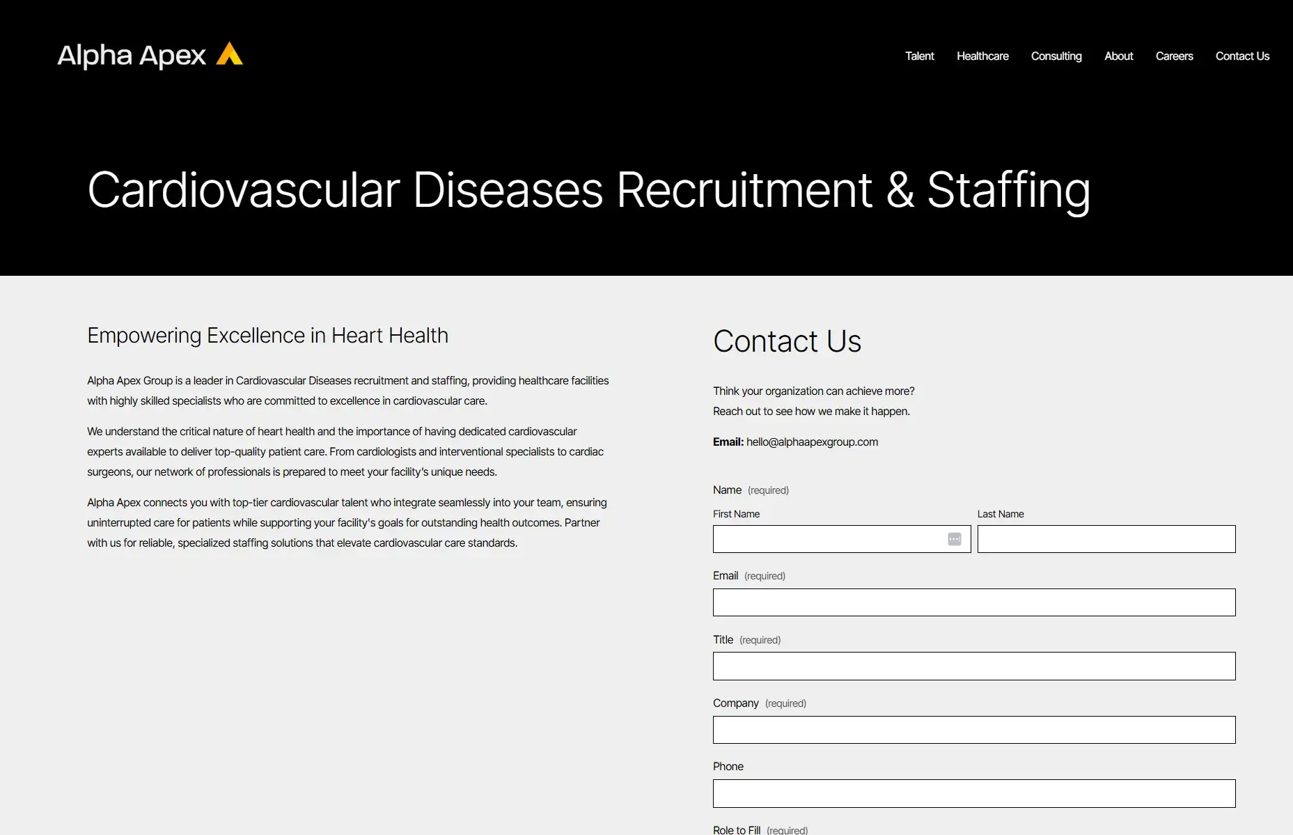 Alpha Apex Group is a premier recruitment firm specializing in the placement of medical professionals focused on cardiovascular disease treatment and management. Known for its expertise in healthcare staffing, Alpha Apex Group connects top cardiologists and cardiovascular specialists with both locum tenens and permanent roles in leading hospitals, clinics, and research facilities.