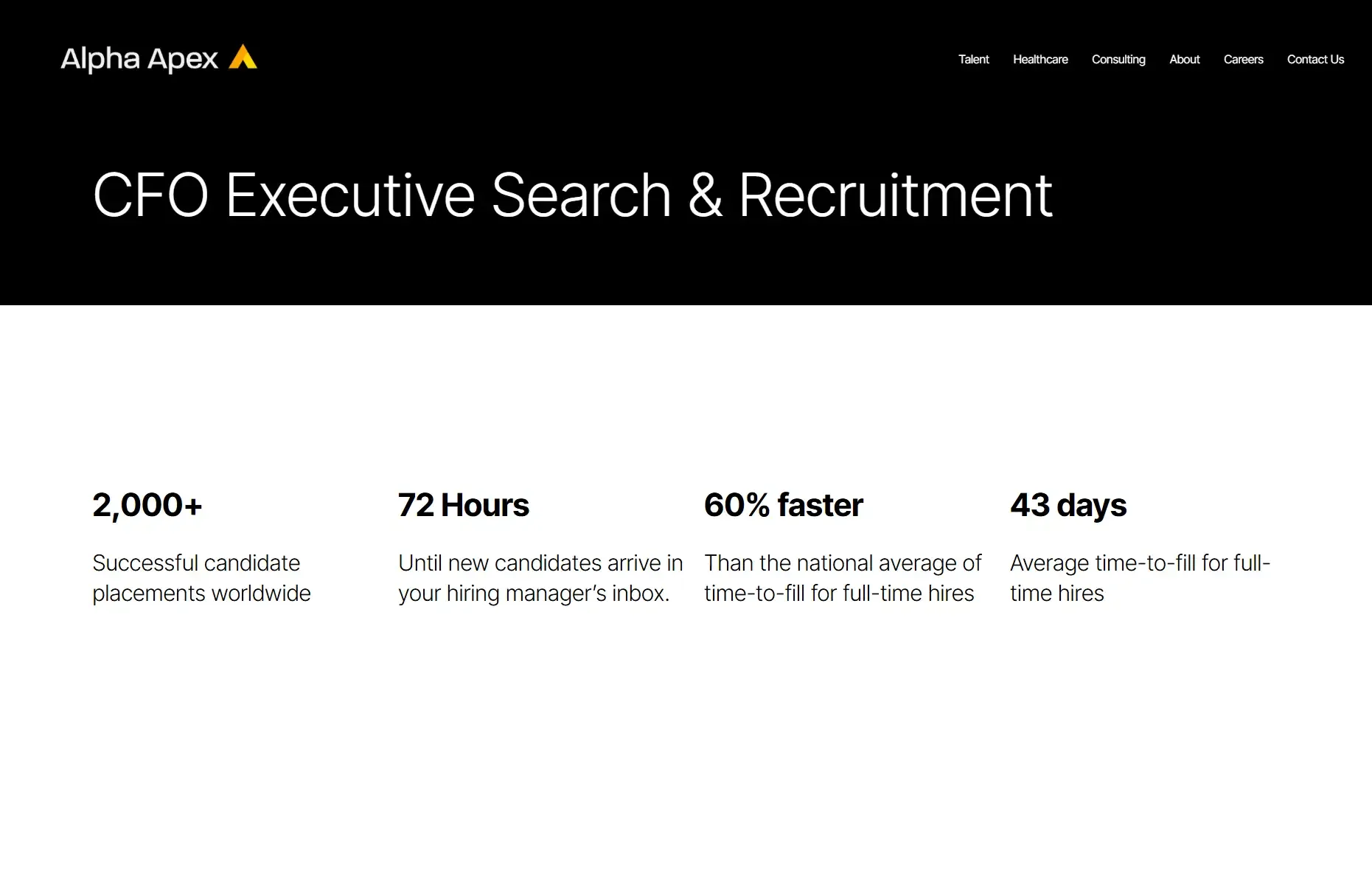 Alpha Apex Group: Alpha Apex Group specializes in executive search for CFOs, blending financial acumen and strategic insight to match companies with leaders capable of guiding financial stability and growth.