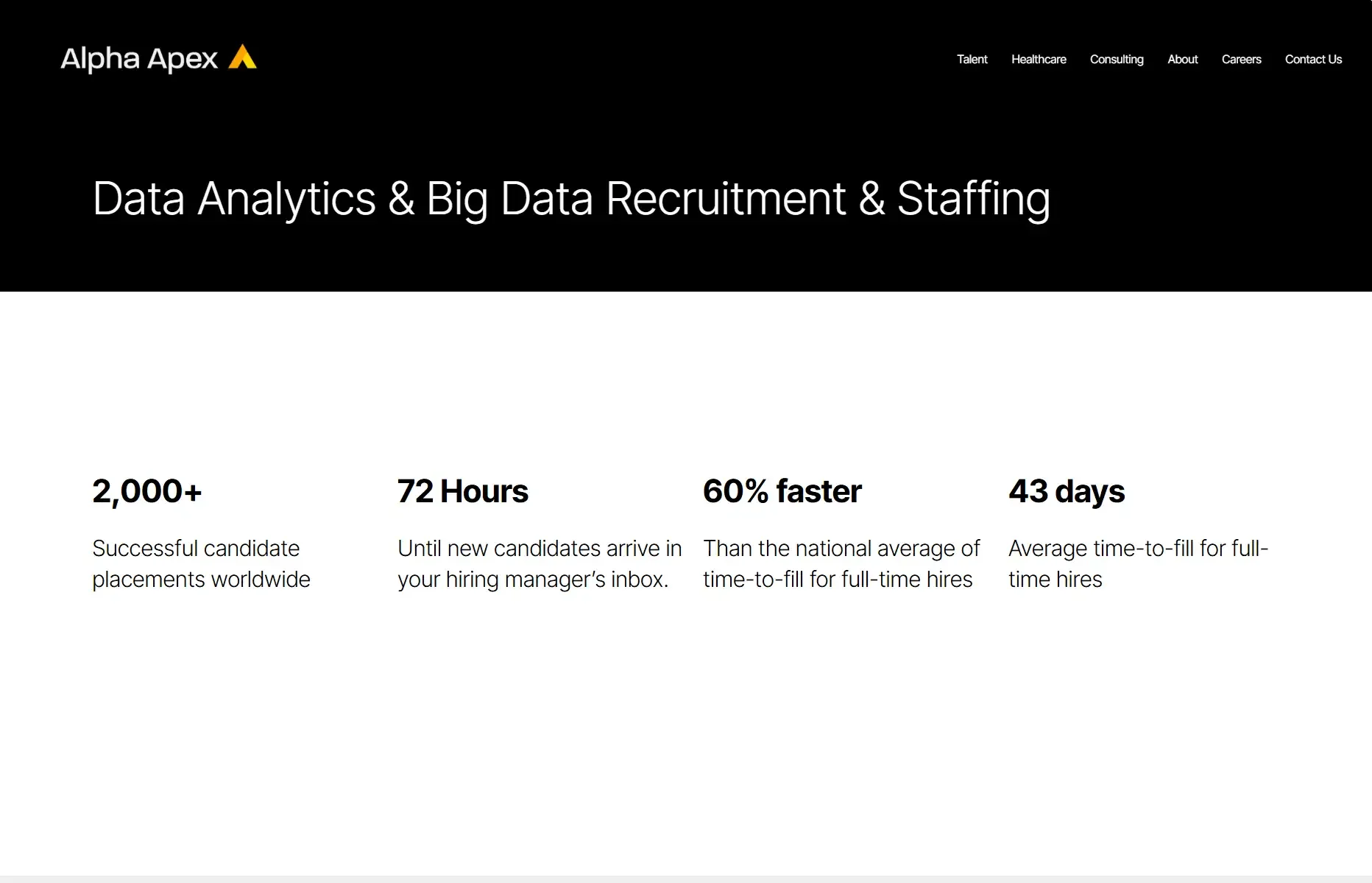 Alpha Apex Group: Alpha Apex Group, a premier recruiter in data analytics and big data, connects top talent with innovative companies, leveraging expertise to drive business growth through strategic placements.