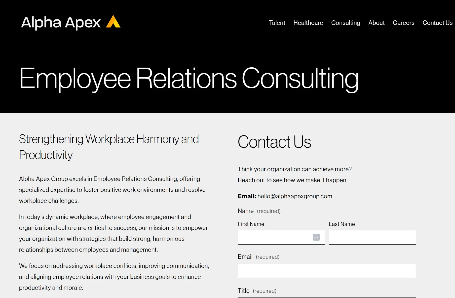 Alpha Apex Group: Helps businesses with expert employee relations consulting, from conflict resolution to engagement strategy. Their tailored, law-savvy solutions boost morale, cut absenteeism, and build cultures where people thrive.