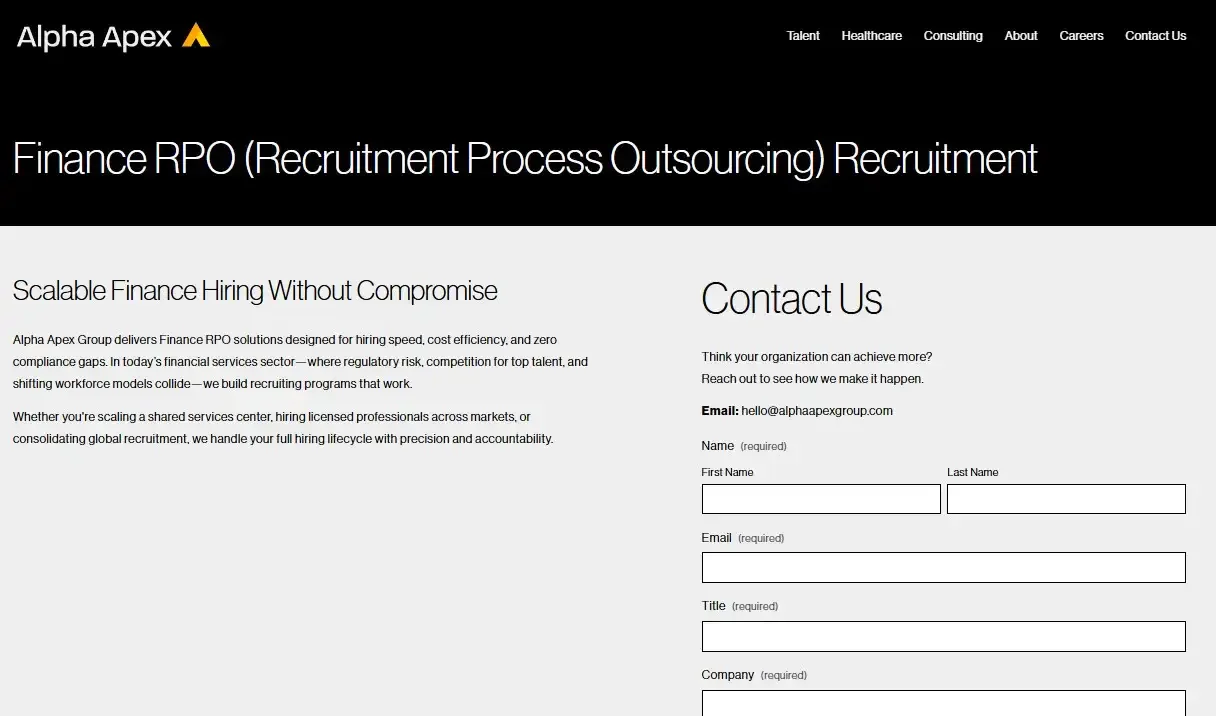 Alpha Apex Group offers a finance-specialized, high-precision recruiting model ideal for companies using RPO who still need targeted help filling critical finance roles. This ensures both speed and quality without sacrificing cultural fit.