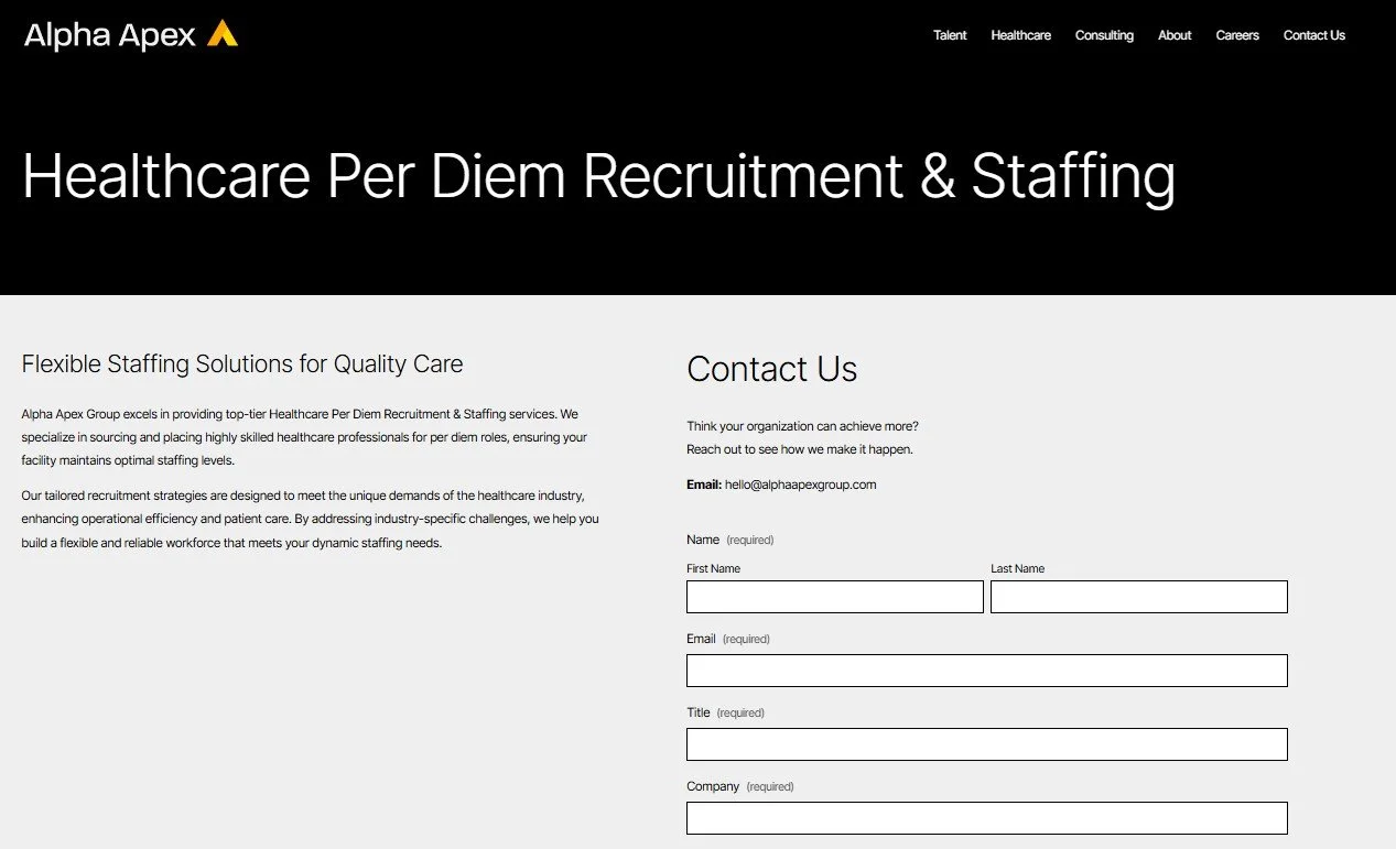 Specializing in healthcare per diem staffing, Alpha Apex Group helps organizations maintain optimal staffing levels, ensuring quality patient care and operational efficiency. Their client-centric approach and comprehensive services make them a trusted partner for medical facilities seeking flexible and skilled healthcare talent.