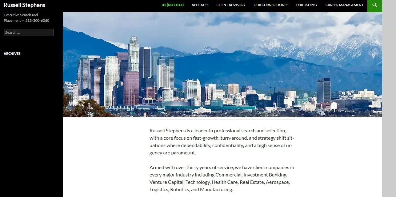Russell Stephens LLC emerges as a distinguished leader in professional search and selection, focusing on scenarios requiring rapid growth, turn-around, and strategic shifts, where reliability, confidentiality, and urgency are critical. With over thirty years of experience, they've provided exceptional service across a broad spectrum of industries, including Commercial and Investment Banking, Venture Capital, Technology, Healthcare, Real Estate, Aerospace, and Manufacturing.