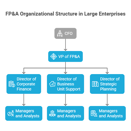 In larger organizations, FP&A teams are more structured and specialized. A typical enterprise FP&A team includes roles such as FP&A analysts, senior analysts, managers, and directors, each responsible for specific aspects of financial planning and analysis.