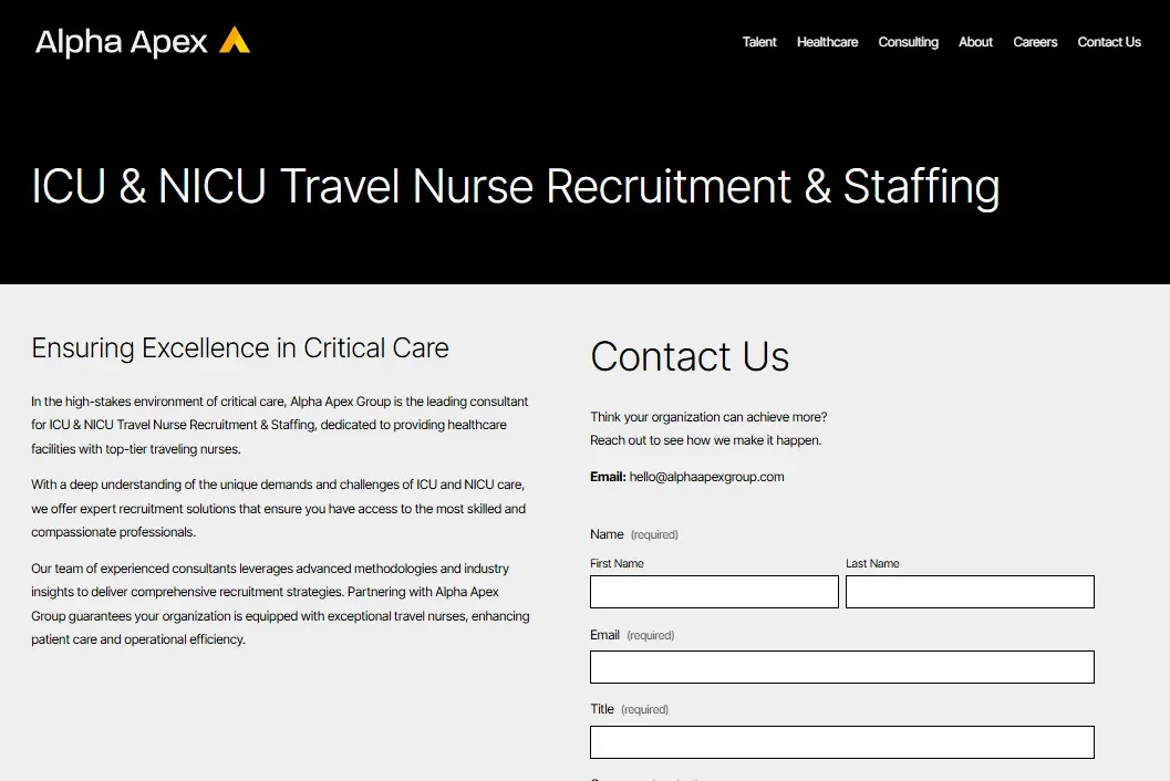 Alpha Apex Group: Alpha Apex Group is a top ICU and NICU travel nurse agency, celebrated for its expertise in placing highly skilled nurses in critical care units nationwide with specialized recruitment solutions that meet the unique demands of ICU and NICU environments.