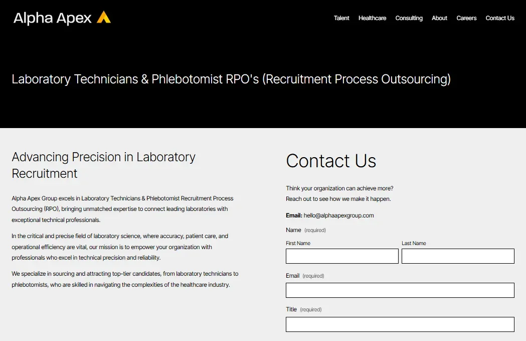 Alpha Apex Group: Alpha Apex Group is a leading provider of Recruitment Process Outsourcing (RPO) services, specializing in the recruitment of laboratory technicians and phlebotomists, ensuring medical laboratories and healthcare facilities can attract and retain highly skilled professionals.