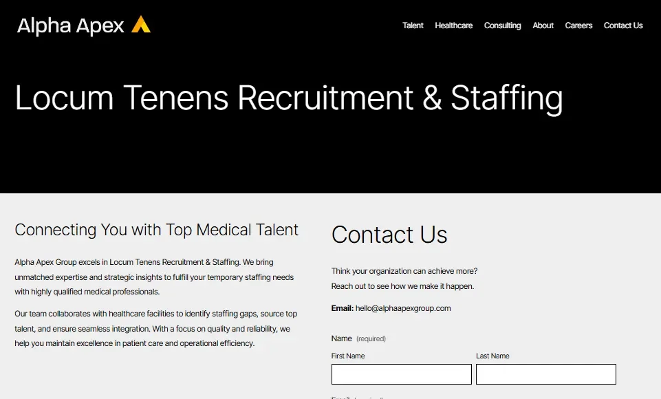 Alpha Apex Group: Alpha Apex Group, a top-tier locum tenens staffing agency, connects healthcare facilities with highly qualified temporary medical professionals, ensuring operational efficiency and high standards of care during staffing shortages.