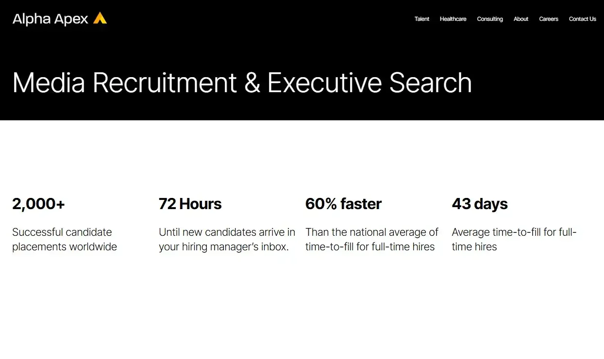 Alpha Apex Group: Alpha Apex Group specializes in media recruitment, offering tailored staffing solutions that match top talent with diverse roles across the media industry, driving organizational success through innovative placements.