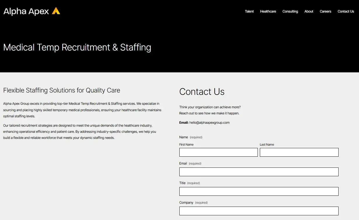 Focused on providing superior temporary staffing services, Alpha Apex Group helps healthcare providers maintain optimal staffing levels and deliver quality patient care. Their client-centric approach and comprehensive service offerings make them a trusted partner for medical facilities seeking flexible and skilled temporary talent.
