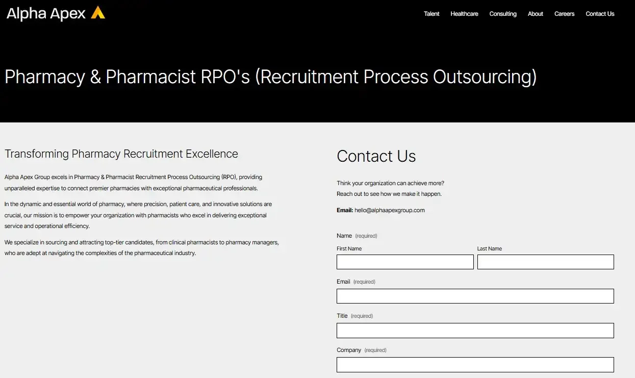 Alpha Apex Group: Alpha Apex Group is a top provider of Recruitment Process Outsourcing (RPO) services in the pharmacy sector, ensuring that healthcare organizations can efficiently attract and retain skilled pharmacists.