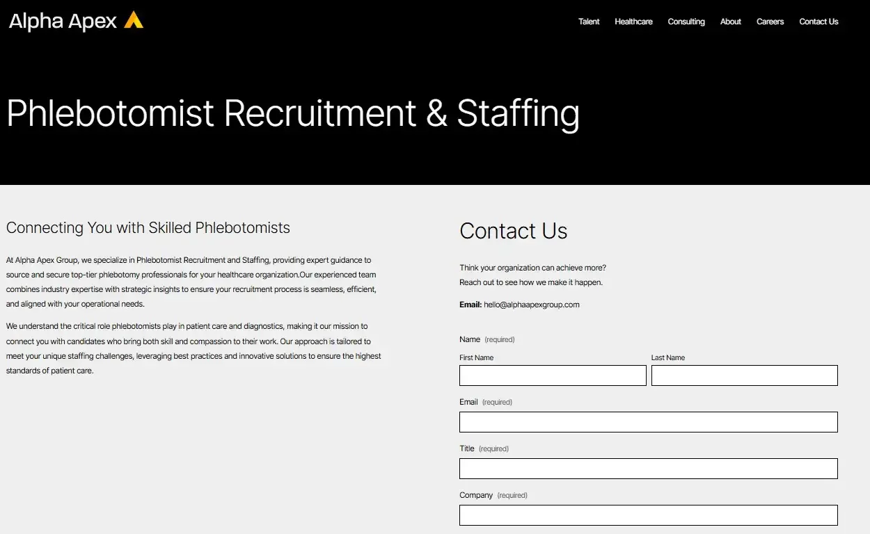 Alpha Apex Group: Alpha Apex Group is a prominent phlebotomist staffing agency, renowned for delivering top-tier talent acquisition and recruitment services in the healthcare industry.