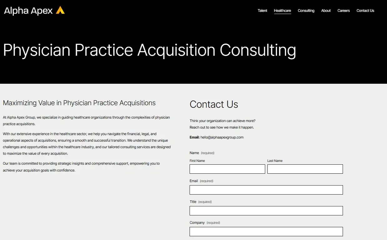 Alpha Apex Group: Alpha Apex Group specializes in physician practice acquisition consulting, offering expert guidance to healthcare organizations for smooth and successful transitions.