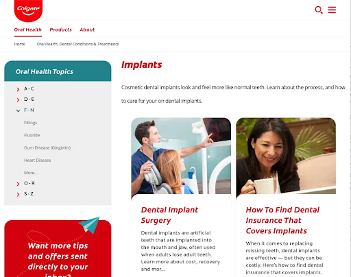 For example, Colgate, the oral health brand, identified the ‘oral implants’ topic cluster and created several related articles. These articles covered the topic comprehensively and answered common questions people have about oral implants. These pieces helped establish Colgate’s authority on the subject and have earned a coveted spot on the number one SERP.