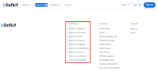 Take ListKit as an example. Their website features detailed comparison pages like ListKit vs. Apollo.io and ListKit vs. ZoomInfo. These help prospective customers make informed decisions while keeping ListKit’s value proposition front and center.