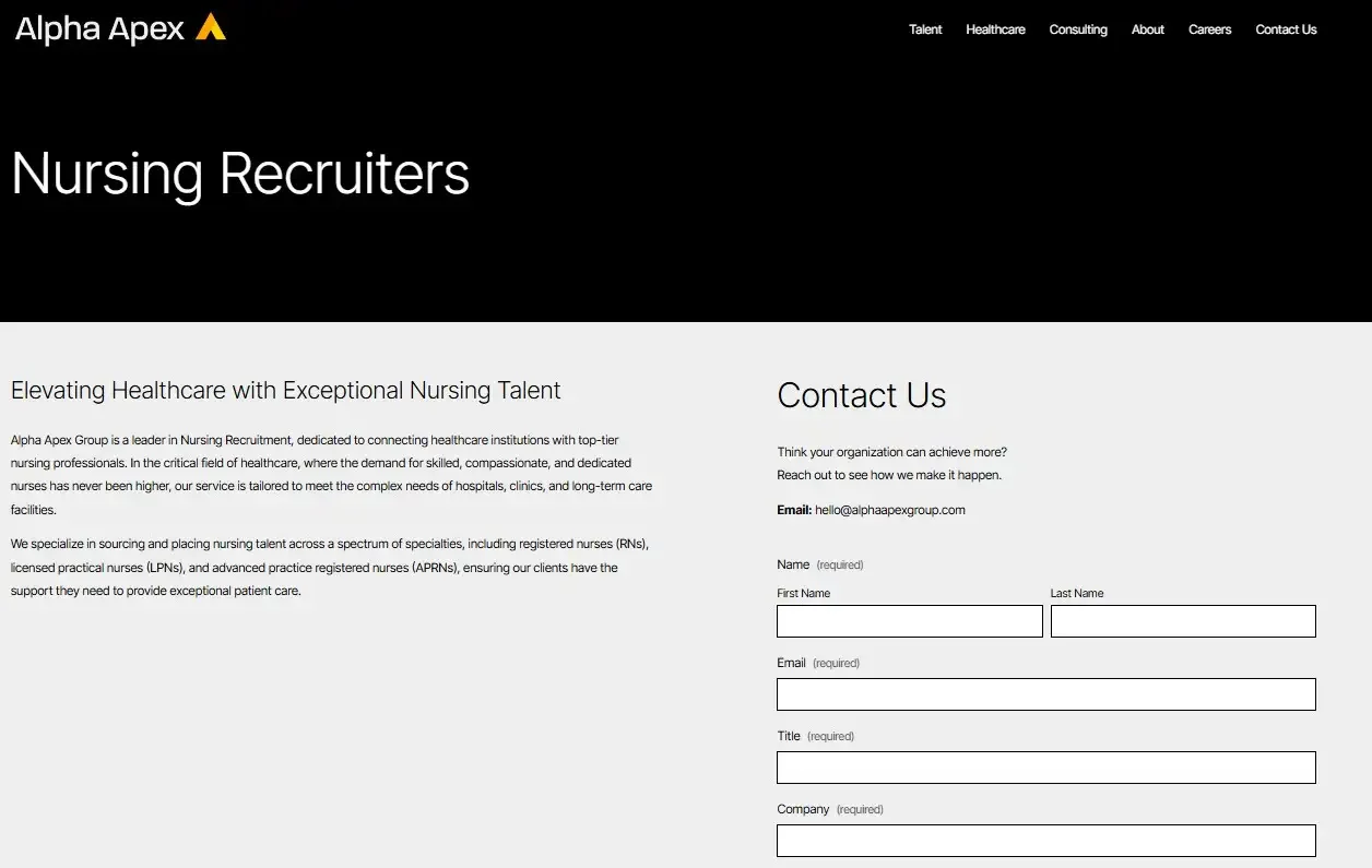 Alpha Apex Group: Alpha Apex Group specializes in nursing recruitment, offering comprehensive services from leadership searches to specialized staff placements, driven by a deep understanding of healthcare needs and a commitment to matching facilities with nurses who excel both clinically and compassionately.