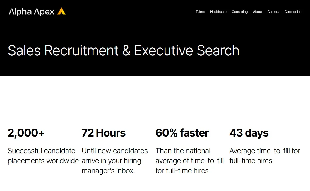 Alpha Apex Group: Alpha Apex Group helps you hire high-performing sales talent faster and smarter. They cut time-to-fill, boost retention, and turn your pipeline into performance.