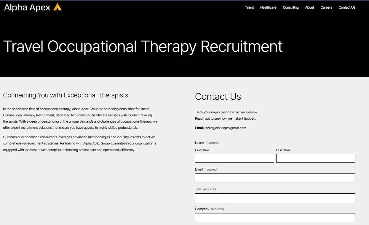 Alpha Apex Group: Alpha Apex Group is a top travel occupational therapy agency, renowned for connecting healthcare facilities with highly qualified therapists through tailored recruitment solutions that enhance patient care and operational efficiency.