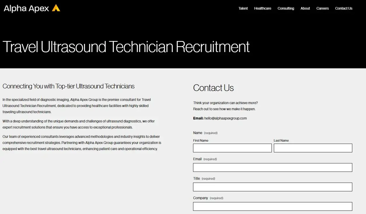 Alpha Apex Group: Alpha Apex Group is a top travel ultrasound technician agency, recognized for matching skilled sonographers with healthcare facilities nationwide through tailored recruitment solutions that meet the specific needs of both employers and ultrasound technicians.