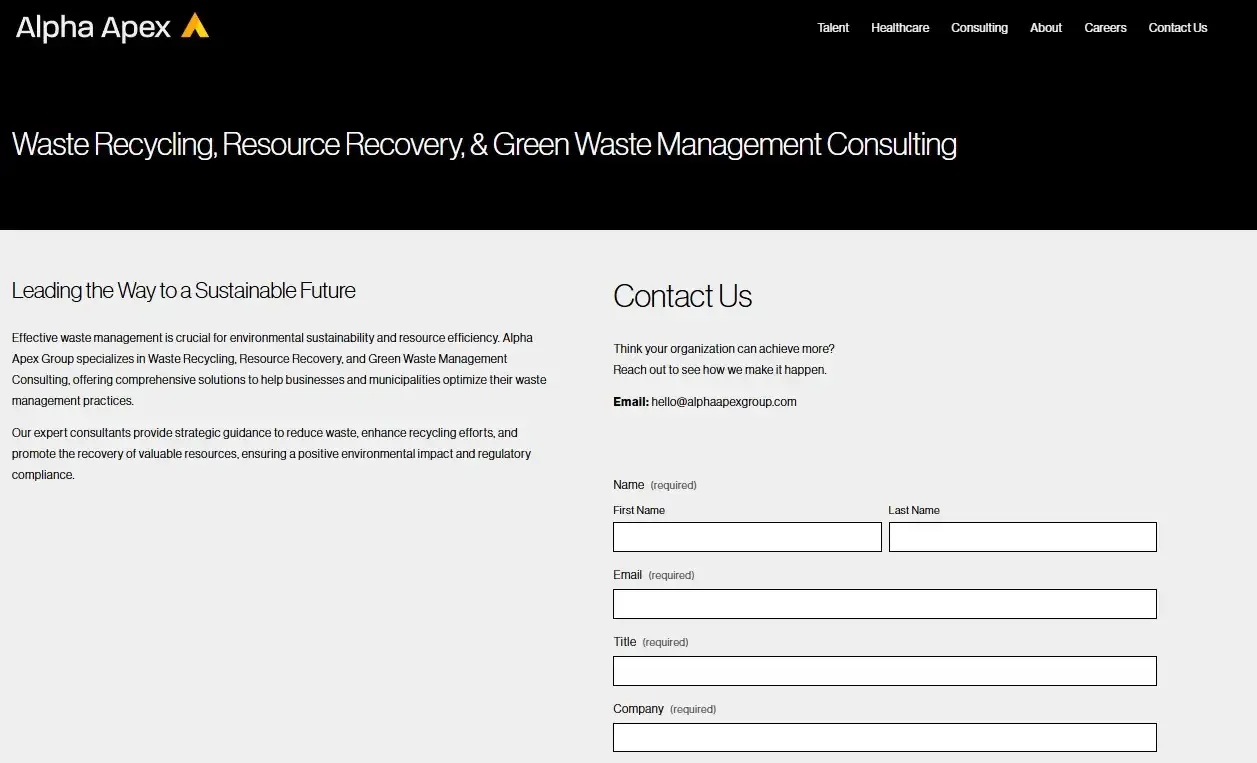 Alpha Apex Group is a leading consulting firm in waste recycling, resource recovery, and green waste management, offering innovative solutions to promote sustainability and environmental stewardship. Their team of experts provides comprehensive services designed to optimize waste management practices, enhance resource recovery, and support green initiatives.