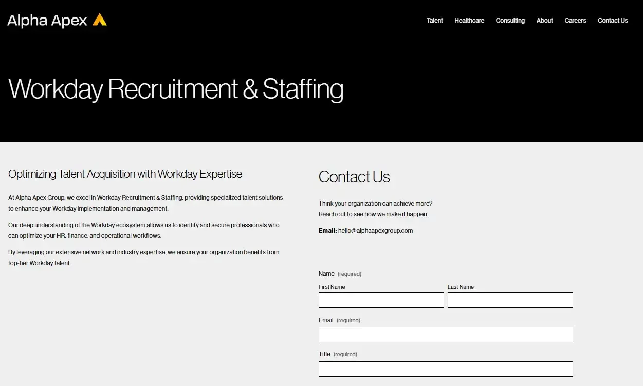 Alpha Apex Group: Alpha Apex Group excels in Workday recruitment and staffing consultancy, delivering top-tier talent solutions globally, specializing in headhunting and executive search, and leveraging extensive industry knowledge to secure the best candidates for critical roles.