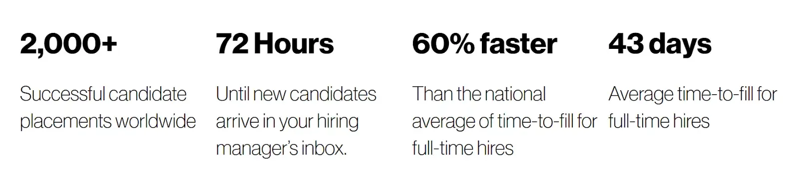 Besides, they also have solid results for candidate sourcing and placing, with an 80% candidate placement success rate and a 90-day replacement guarantee.